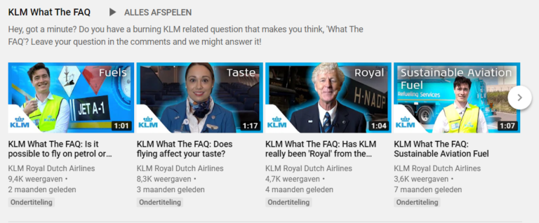 KLM heeft een bestemmingen rubriek zowel als belevingspagina op de website als een video-serie via YouTube.